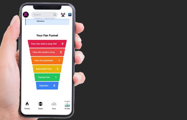 The funnel is a tally of user actions across your entire discography. It is widest at the top (casual interactions) and narrowest at the bottom (commercial transactions). It represents a typical “fan journey” as the listener experiences going from discovering a new song, to becoming a SupaFan.